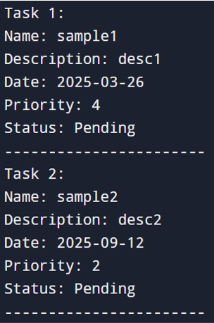 While basic, this task manager is a good demonstration of data handling, user interface logic, and functional program structure in C. Future improvements could include persistent storage via file I/O and task sorting or searching features.